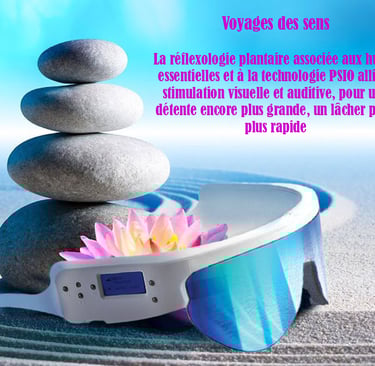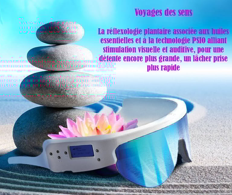 La réflexologie plantaire associée aux huiles essentielles et à la luminothérapie avec la technologie PSIO permet une détente plus grande, un lâcher prise plus rapide, permettant ainsi de décupler l'action du massage et d'augmenter les facultés d'autorégulation de l'organisme.